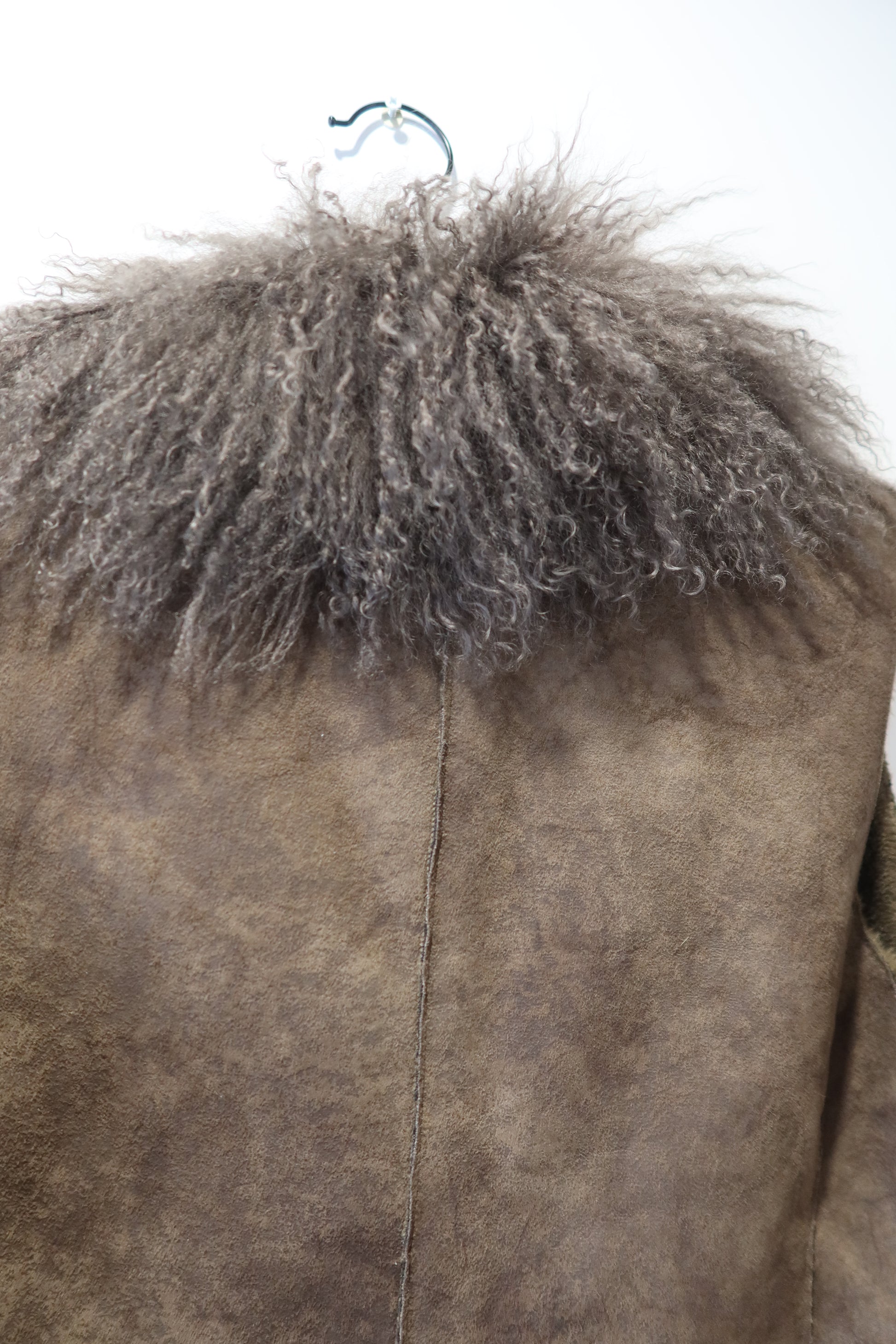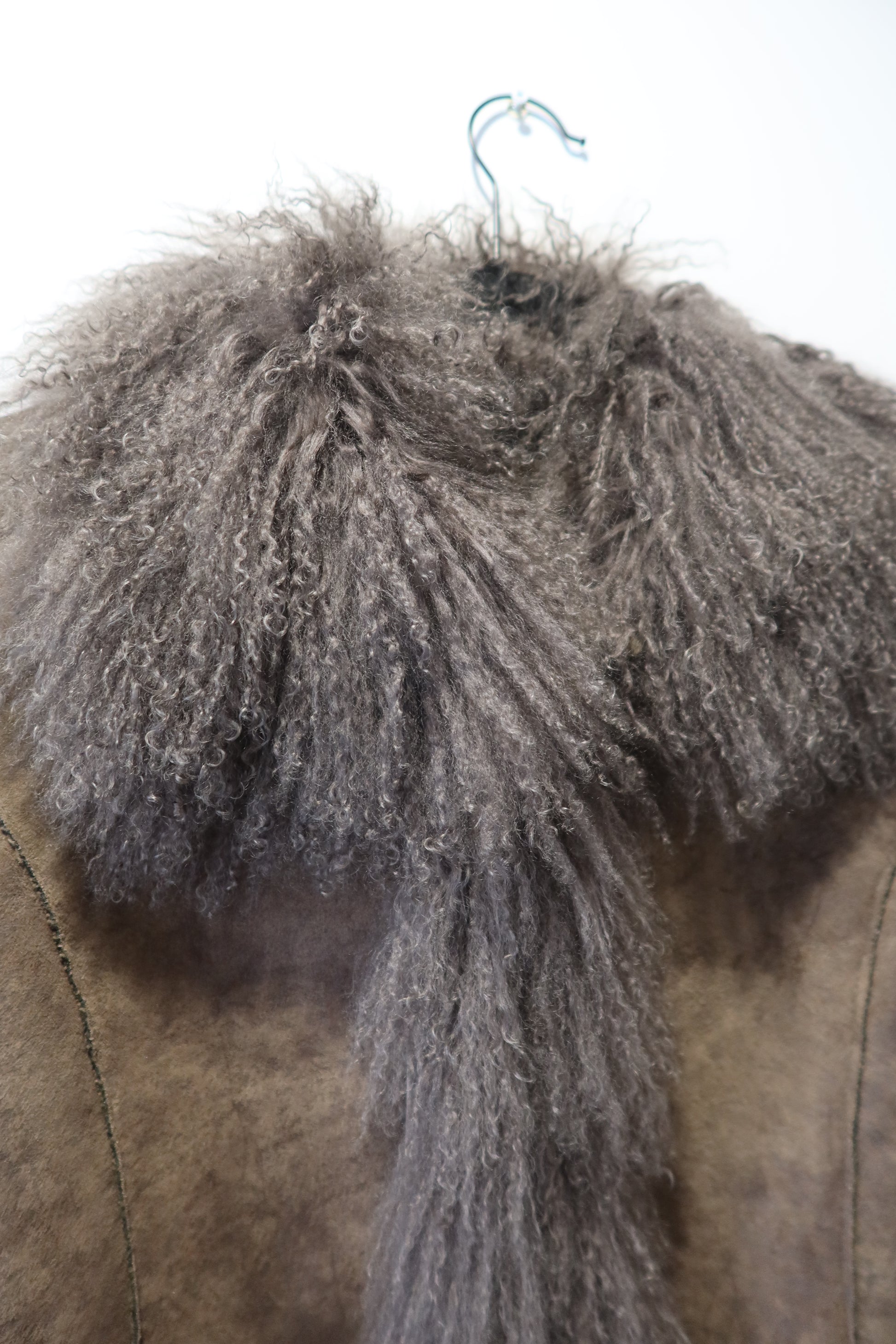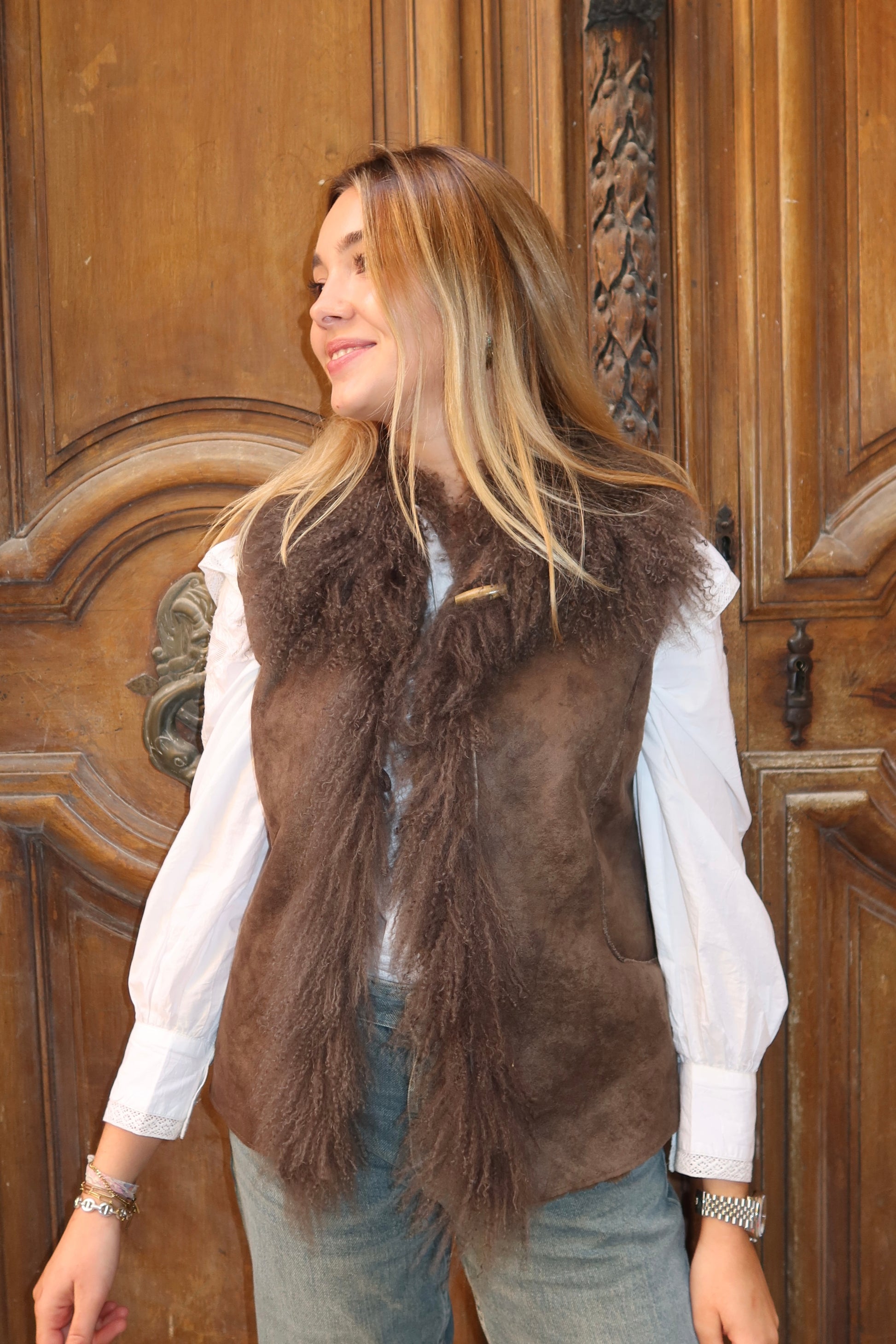 Gilet sans manches en peau retournée gris. Col et bordures en fourrure de mouton véritable. Poches avant. Fermeture devant par boutons brandebourgs.