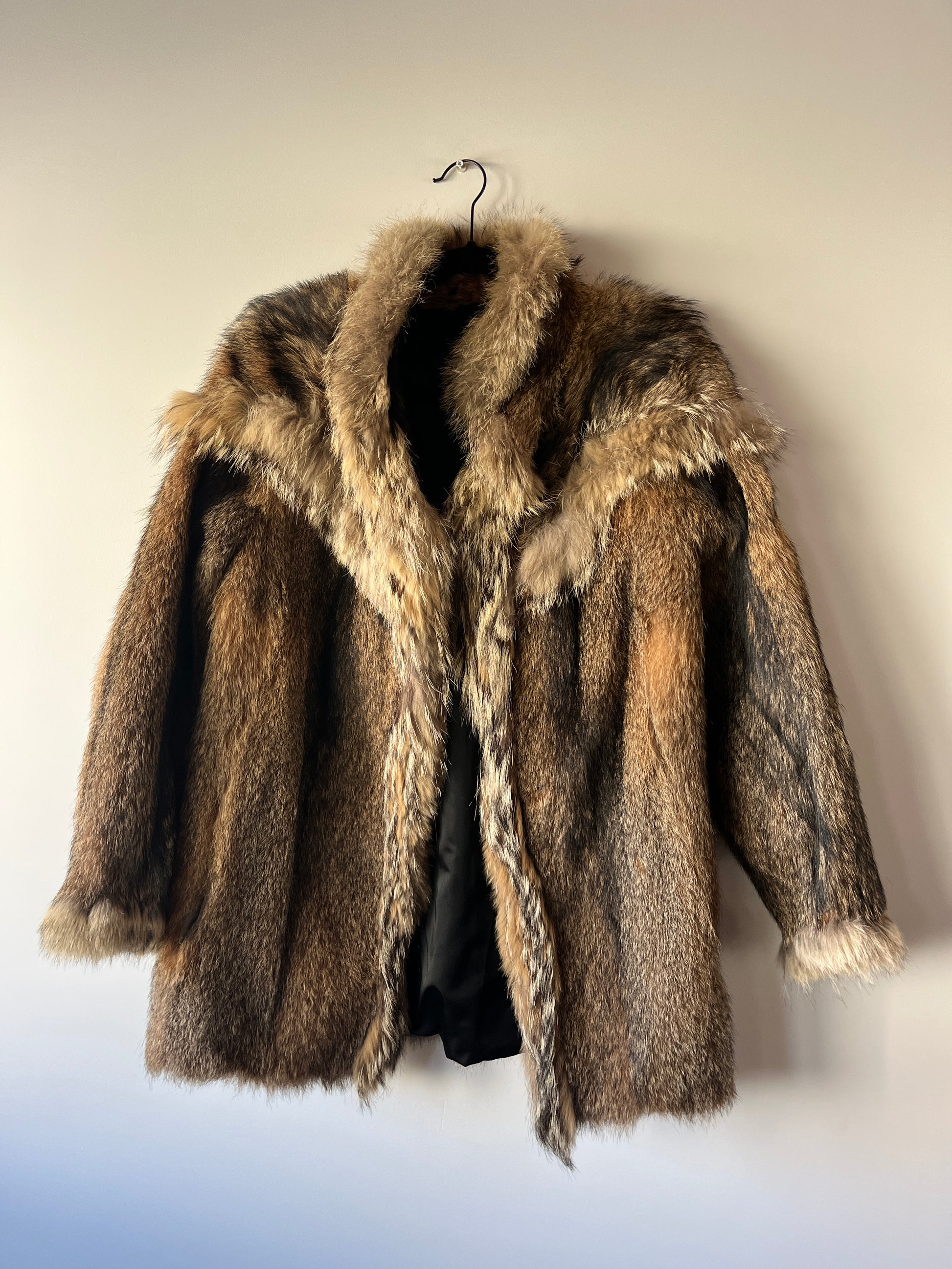 Manteau en fourrure véritable avec un mélange de gris, marron, beige et noir, manches longues. Deux types de fourrures. Doublure intérieure noire. Poches avant. Fermeture devant par 3 crochets en métal dissimulés.