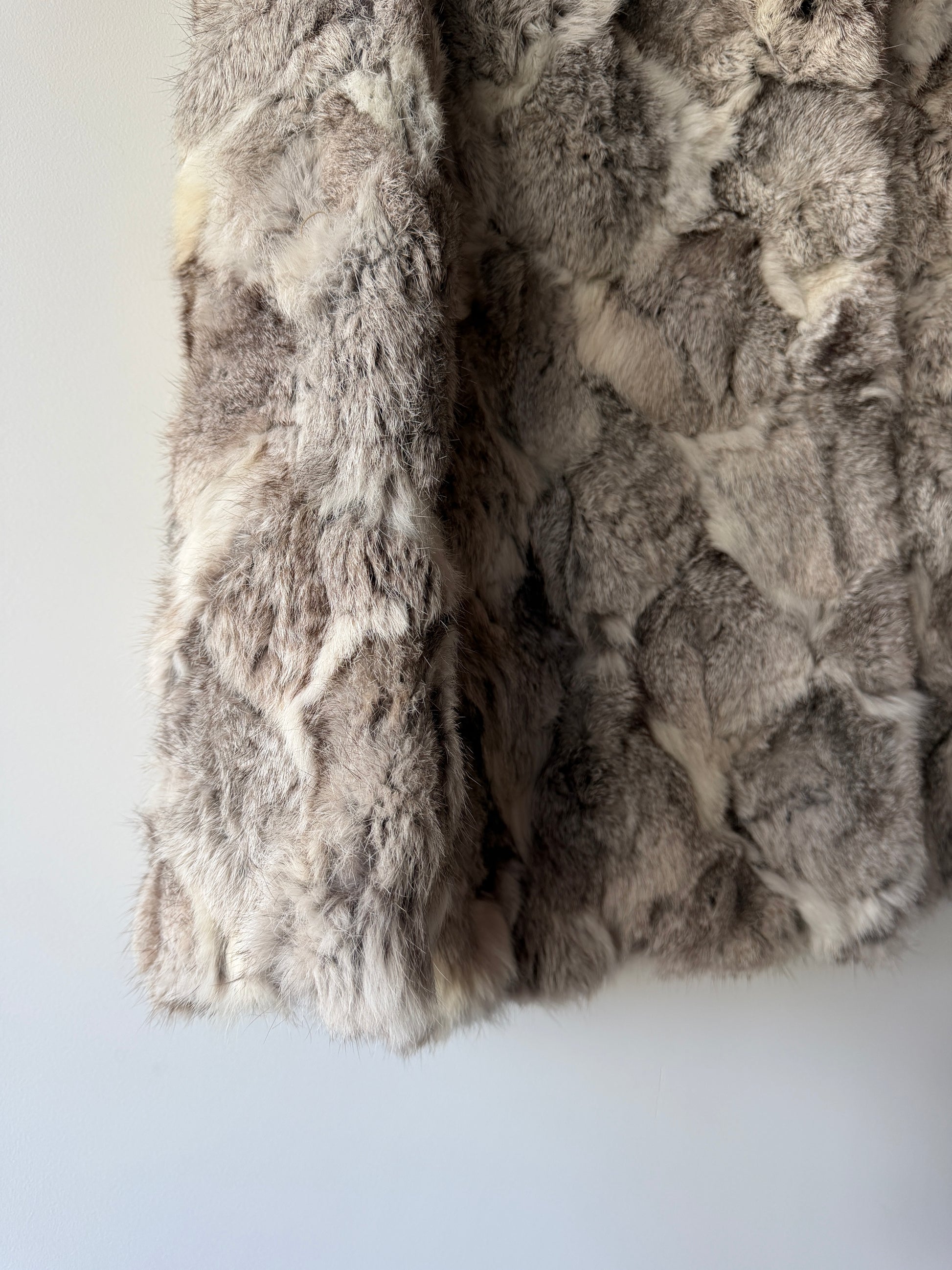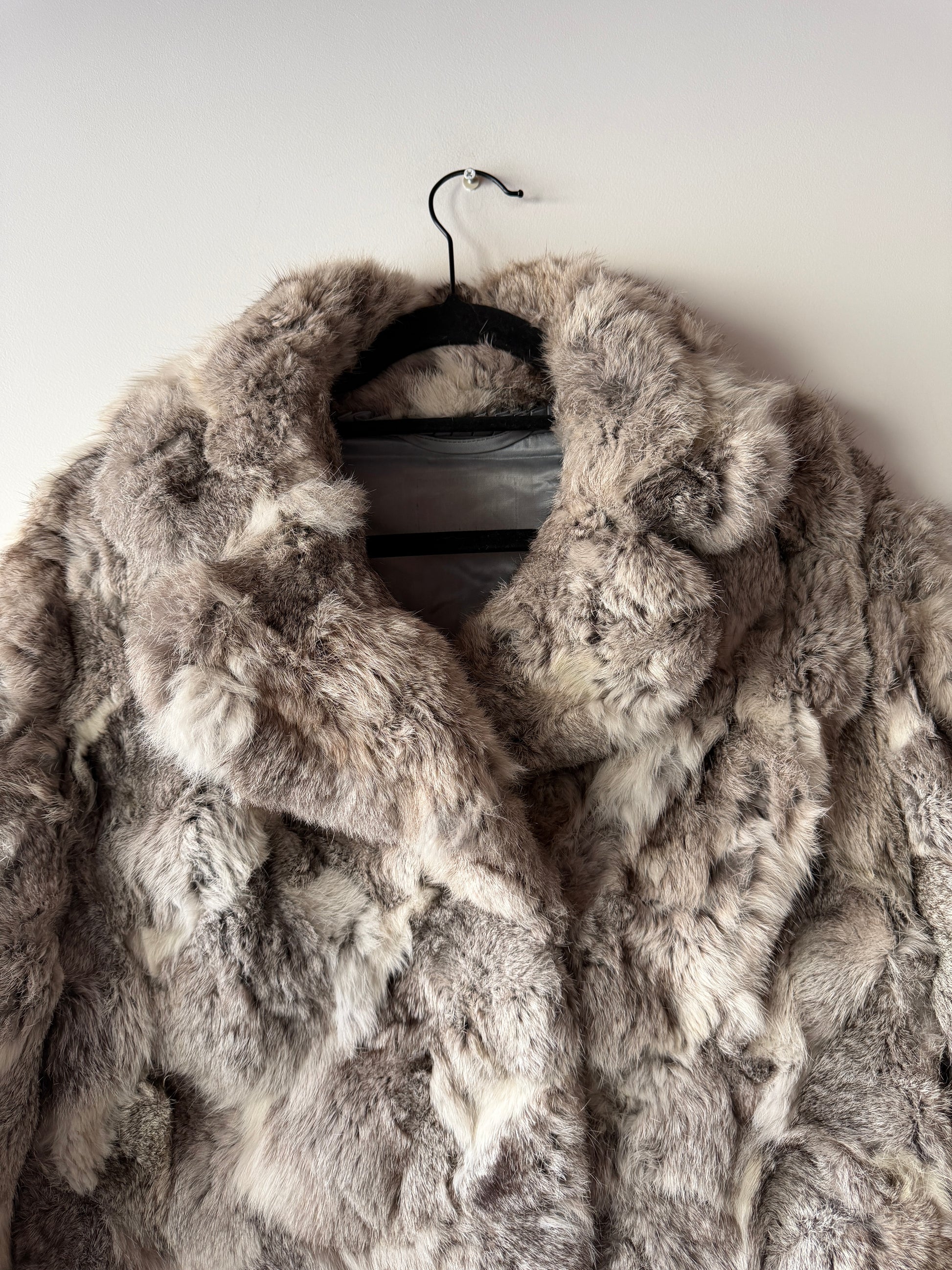 Manteau en fourrure véritable gris et blanc à manches longues. Très doux. Col V à revers. Doublure intérieure bleue. Poches avant. Fermeture devant par crochets en métal dissimulées.