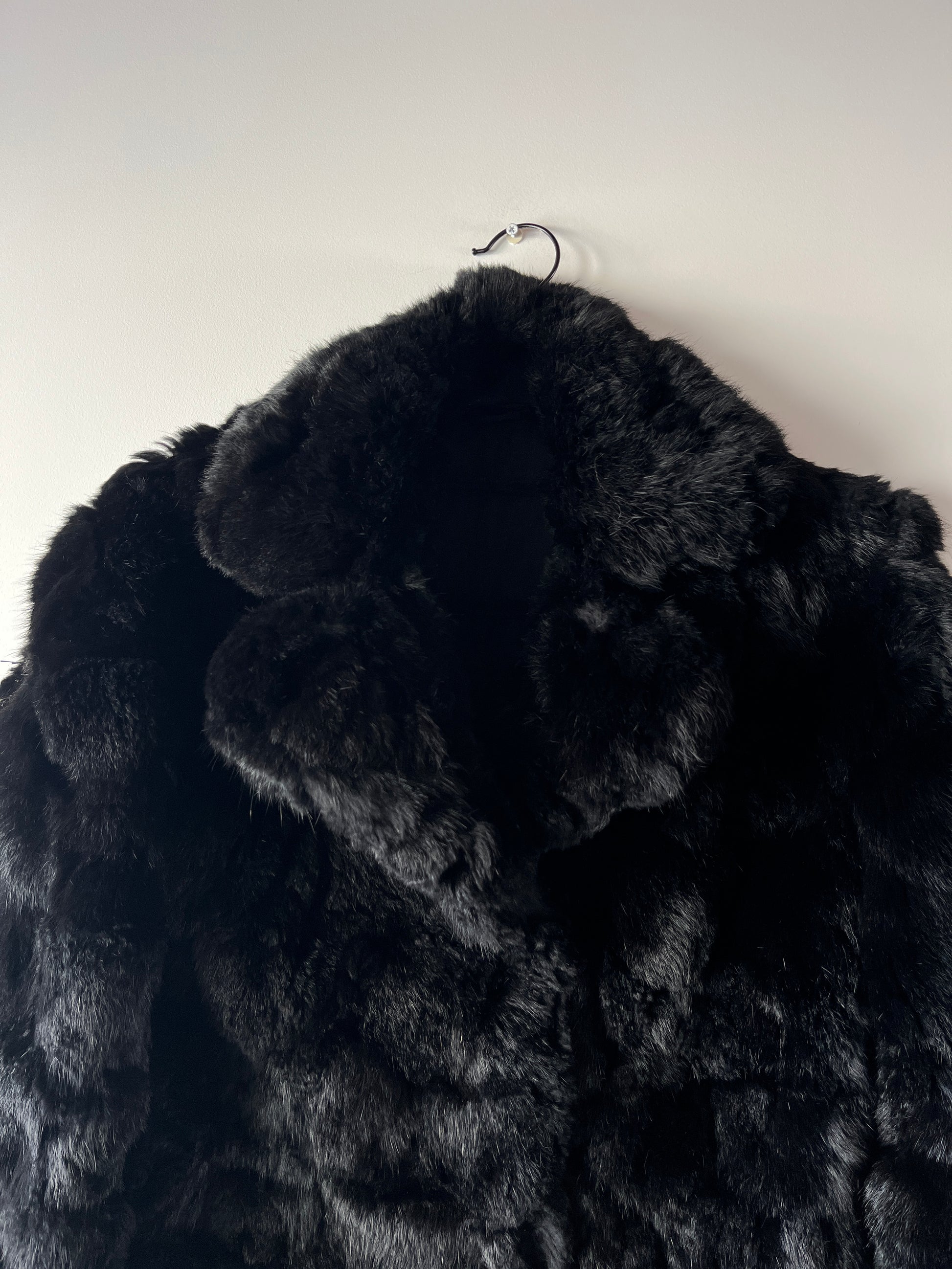 Manteau en fourrure véritable noir à manches longues. Épais, très doux et chaud. Col V à revers. Doublure intérieure noire. Poches avant. Fermeture devant par crochets en métal dissimulés