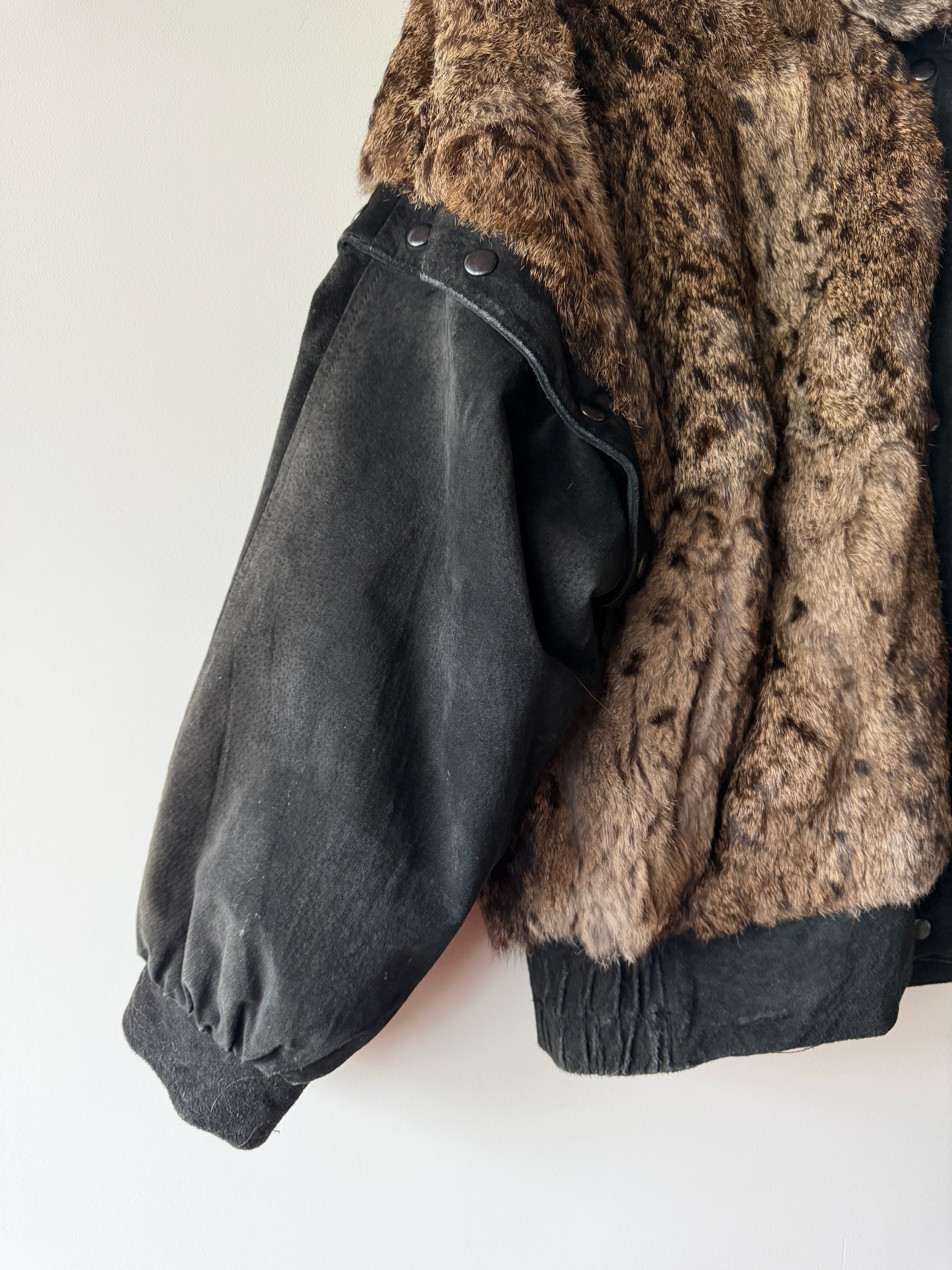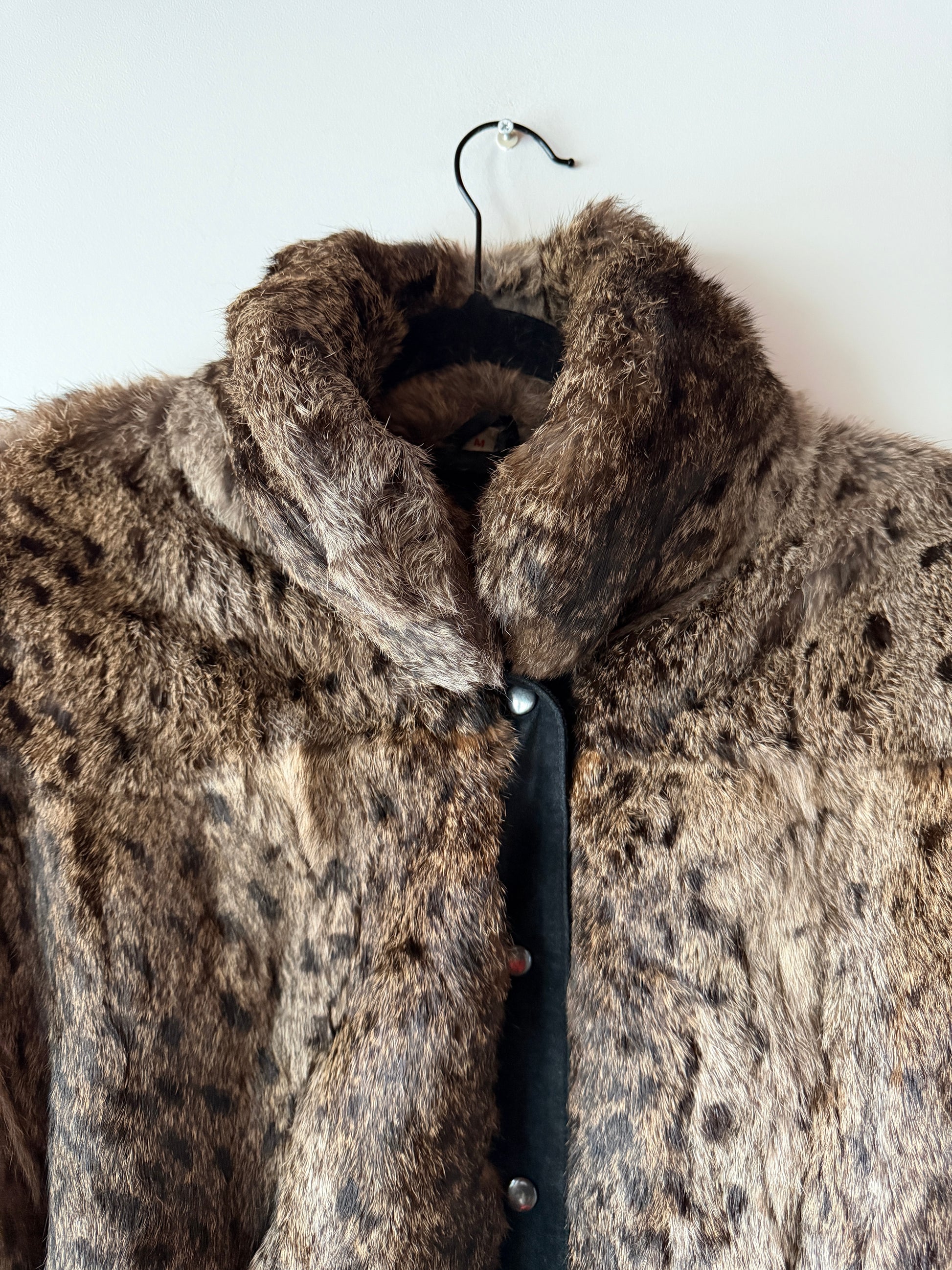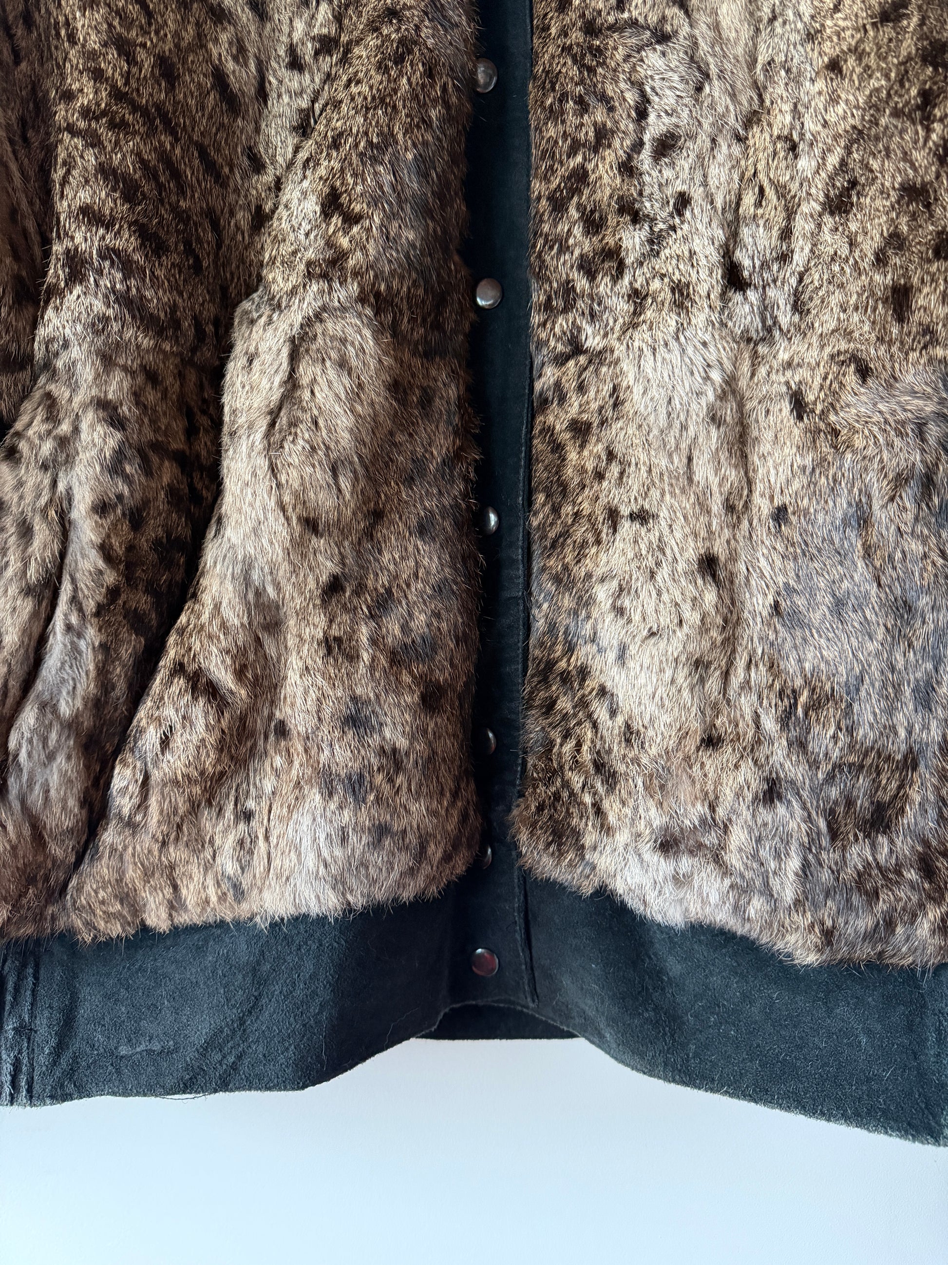 Veste en fourrure véritable grise et noire imprimée. Très douce. Manches longues en cuir noir attachées par boutons pression. Col montant. Doublure intérieure noire. Deux poches avant. Fermeture devant avec boutons pression le long.