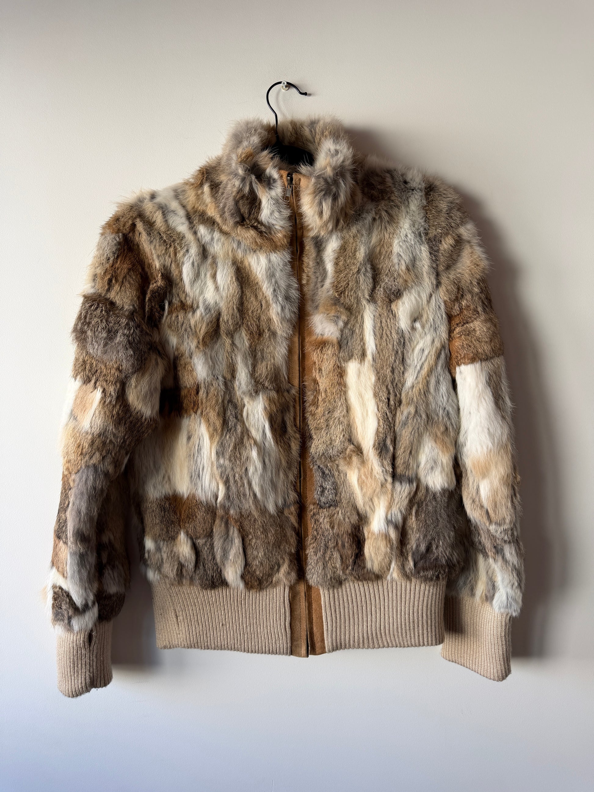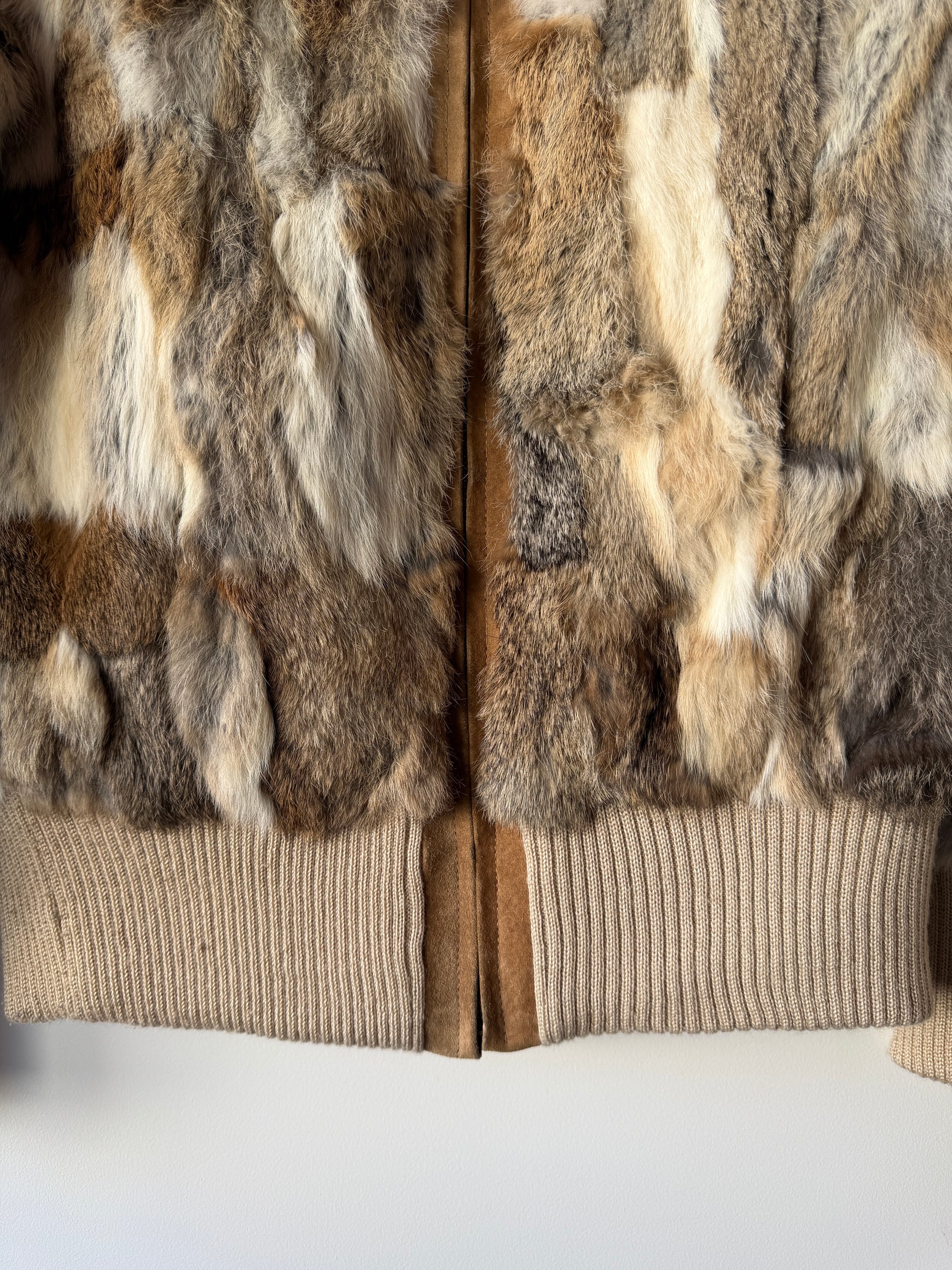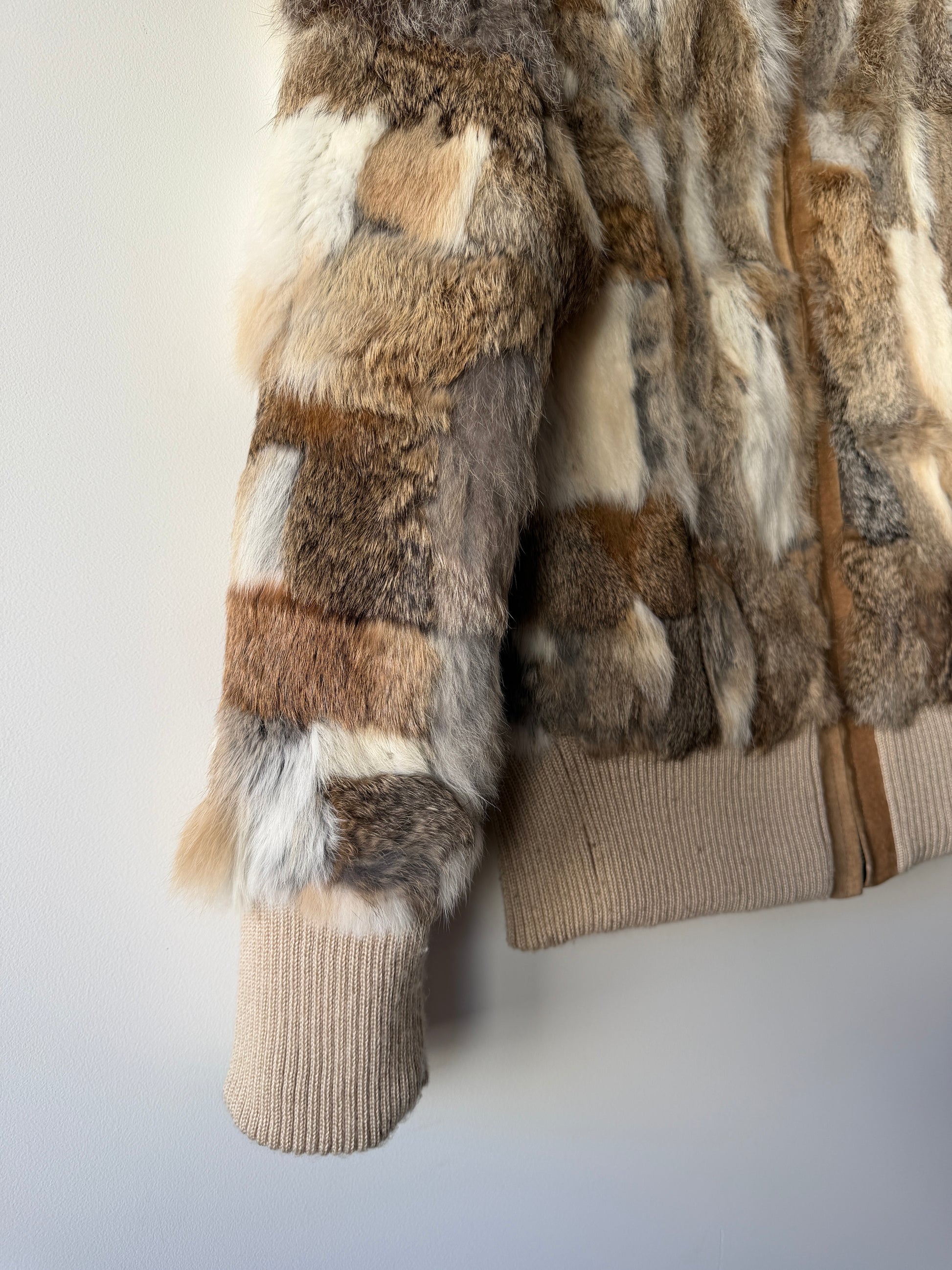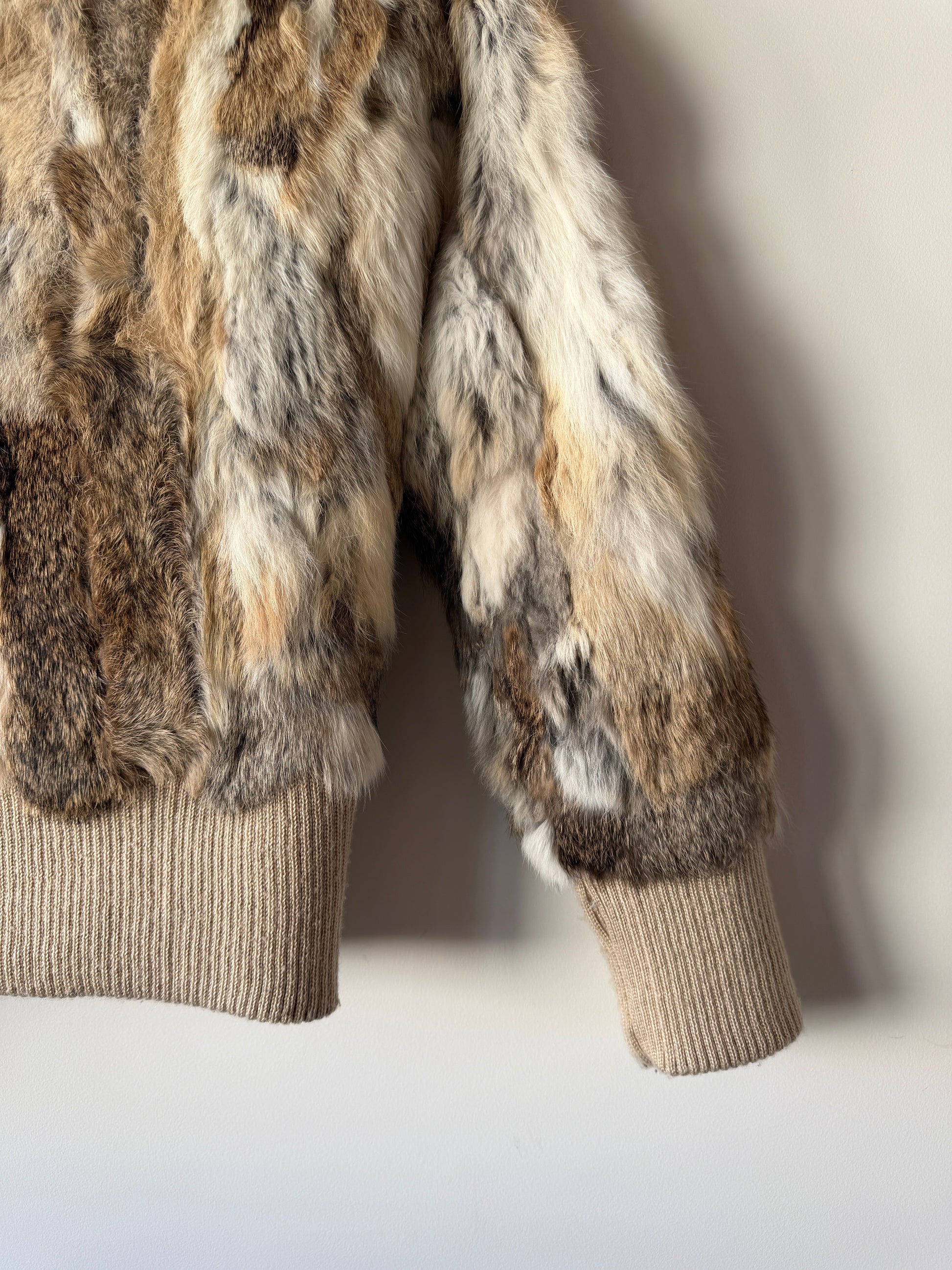Veste courte en fourrure véritable blanche, marron et grise manches longues. Très douce. Resserrée aux poignets et à la taille avec une bande de tissu beige élastique. Col montant. Doublure intérieure beige. Fermeture éclair argentée.