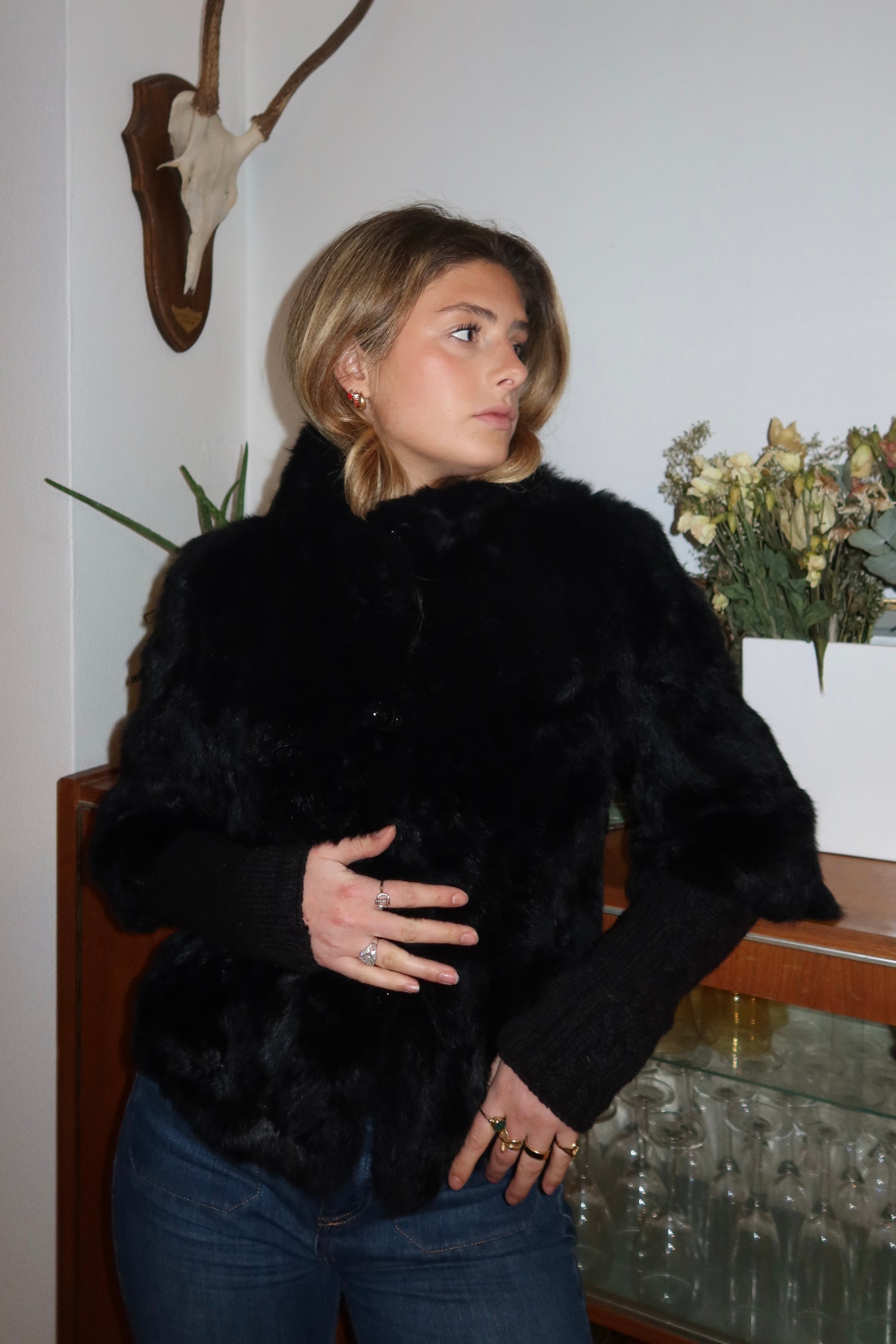Veste en fourrure véritable noire manches courtes avec manches intégrées en laine tressée. Très douce. Col à porter à revers ou montant. Doublure intérieure noire. Fermeture devant avec des boutons noirs jusqu'au col.